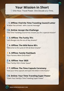 It’s a playful, one-hour family bonding adventure where you “travel” through four imaginative eras — the ‘70s, the ‘90s, a family flashback, and the future — completing fun missions in each.