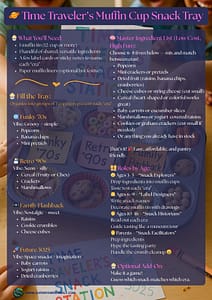 Each set of muffin cups represents a different time era — filled with fun finger foods like popcorn, fruit, crackers, and sweet surprises.